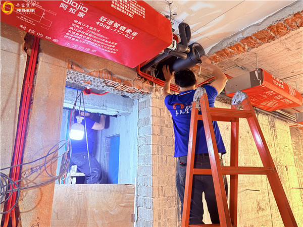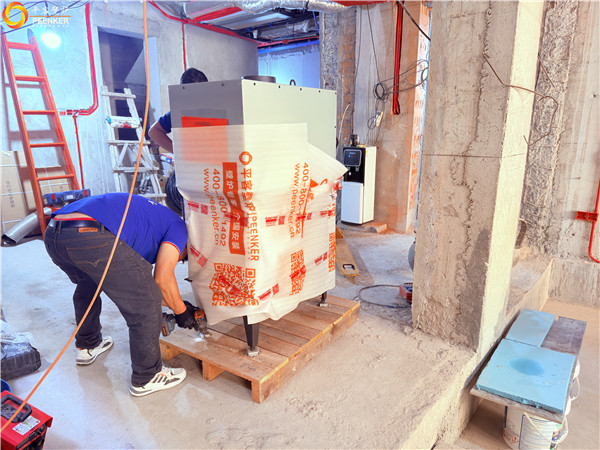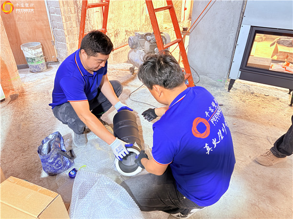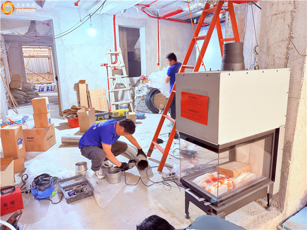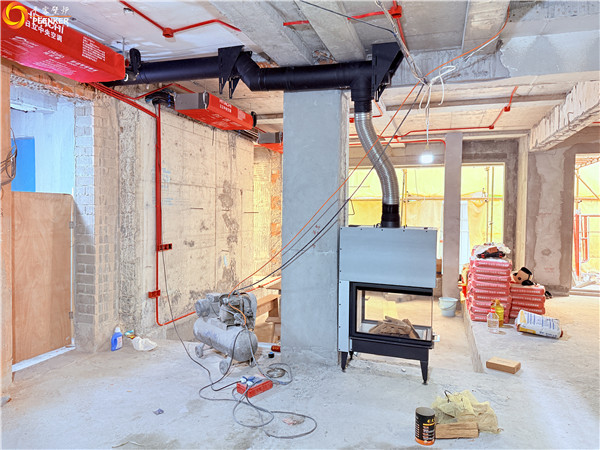 項目情況:項目位于上海青浦鎮(zhèn),壁爐安裝客廳立柱位置,室內(nèi)煙囪橫向過長,戶外使用風(fēng)機(jī)解決抽力問題。由平客壁爐項目部帶隊上門安裝。